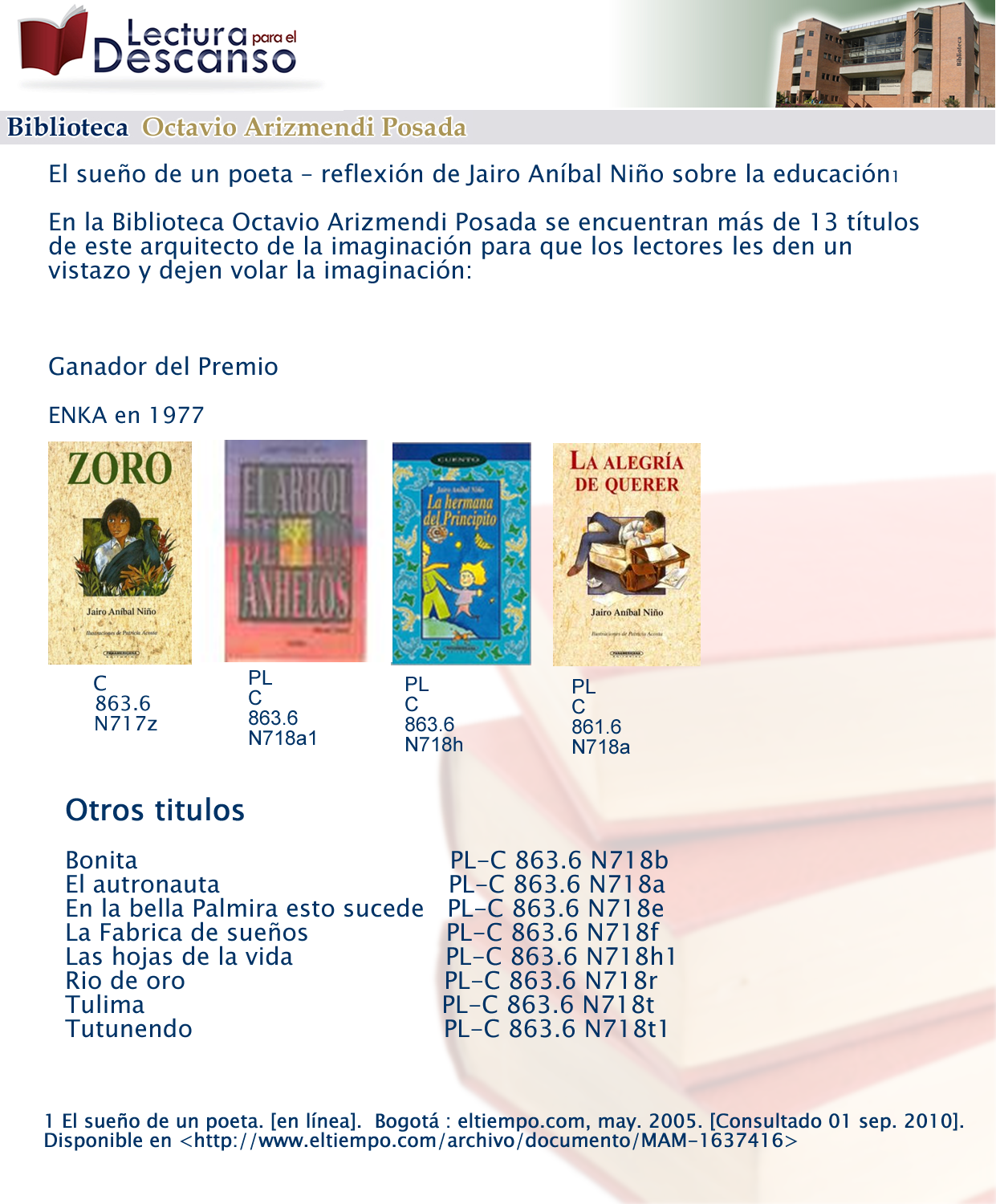 […] delo okarakterisano jednostavnim načinom pisanja koje očaravalo ne samo decu već i odrasle. O tome pišu Luisa Margarita Enao i Felipe Kontreras na blogu Biblioteke Oktavio Arsimendi Posada: Jairo Aníbal […]